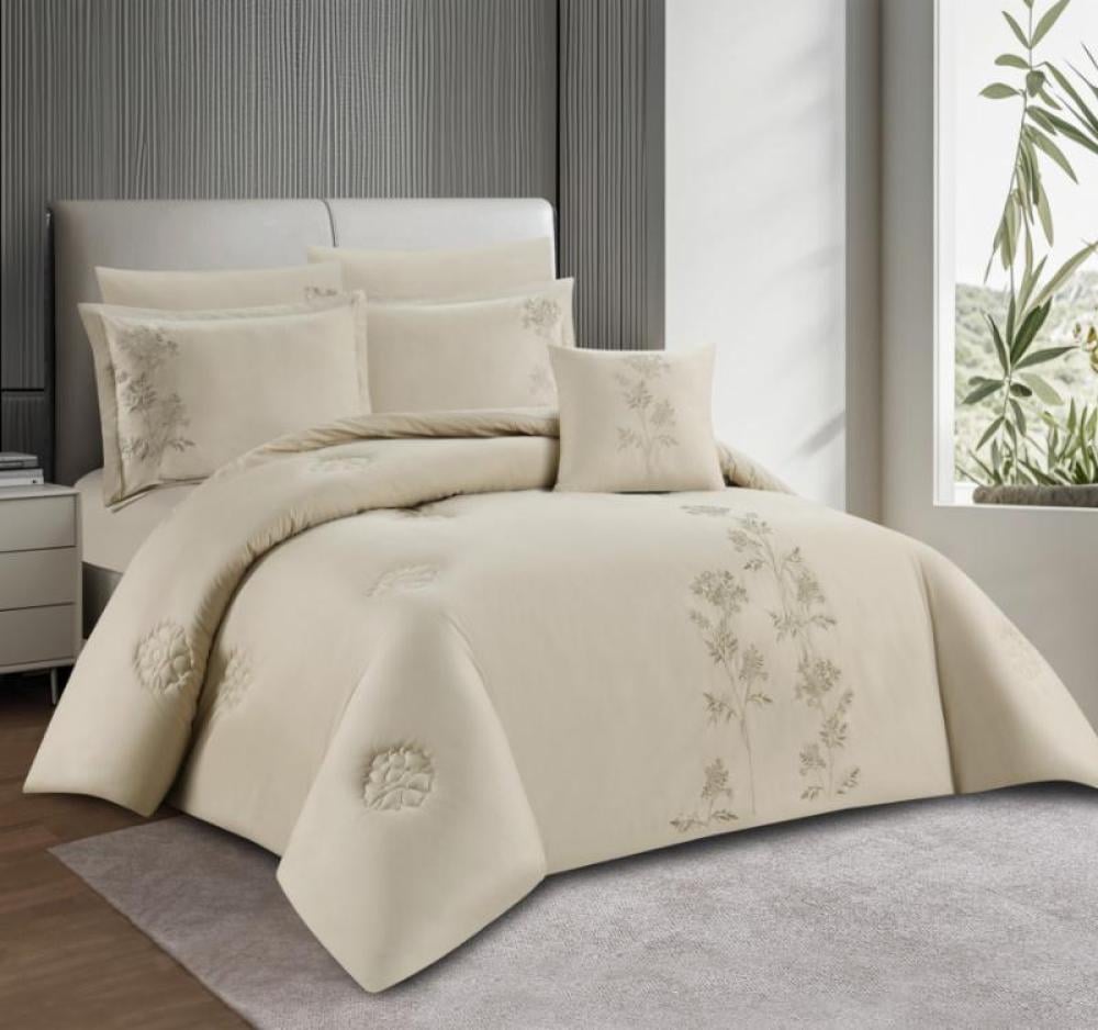 - تصميم مطرز عصري وناعم يزين اللحاف والمخدات بإحساس طبيعي يشبه النباتات.