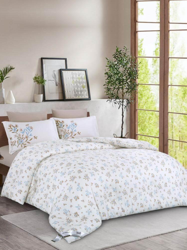 مصنوع من قماش ميكروفايبر ممشط عالي الكثافة بملمس يشبه القطن، مع حشوة خفيفة مناسبة لأجواء الصيف. مثالي للنوم الهادئ والديكور الناعم.