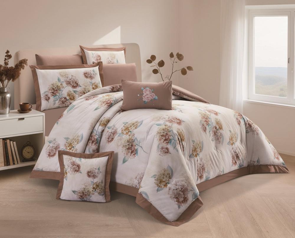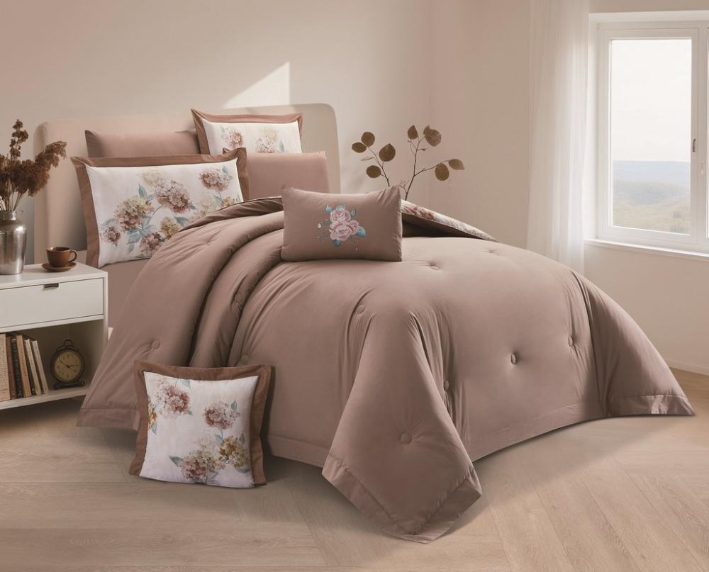 يأتي المفرش بـ 8 قطع متكاملة تشمل كل ما تحتاجه لتجديد غرفتك بذوق راقٍ، من اللحاف الكبير إلى الشراشف والمخدات المزخرفة بتطريز أنيق.