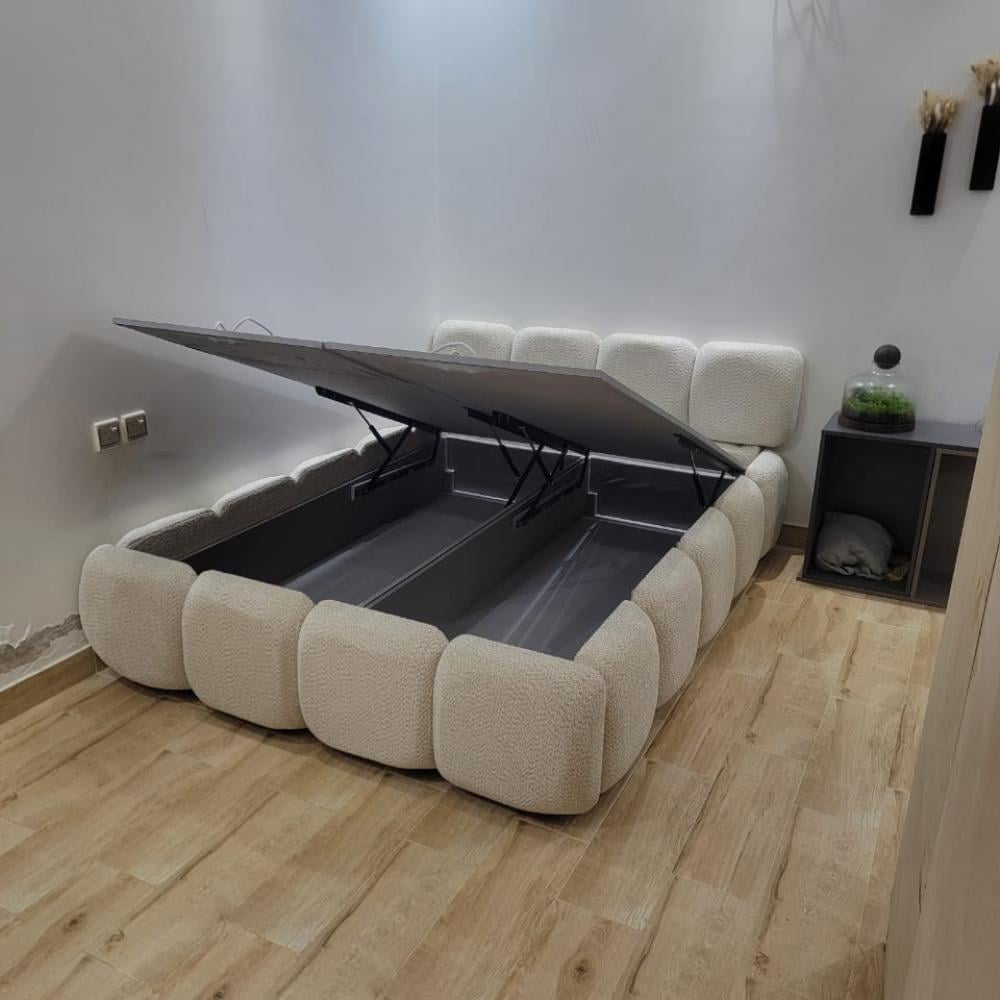 تصميمه الفاخر يدمج الراحة والجمال، بينما نظام الرفع الهيدروليكي التركي يجعل فتح السرير سهلاً وآمناً لتخزين البطانيات، المفارش أو الوسائد دون أي عناء.